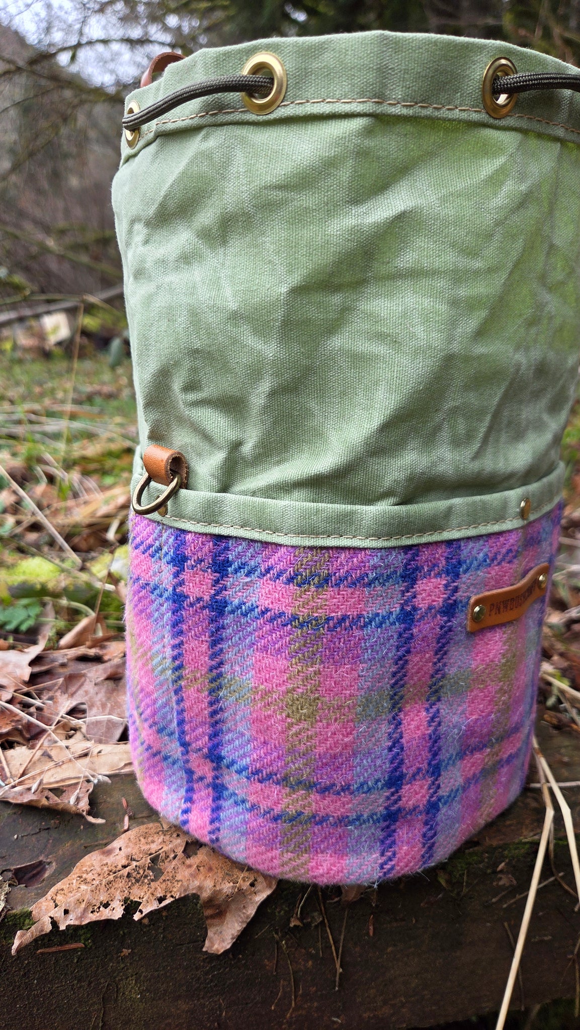 Vintage wool plaid wrapped around the pocket section