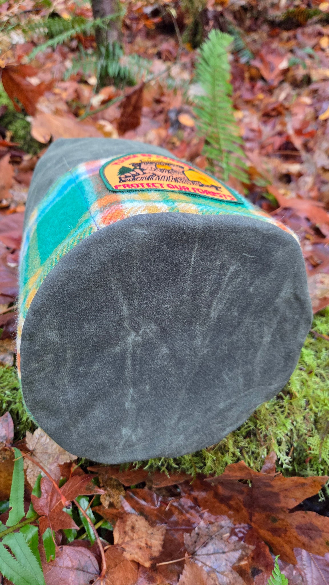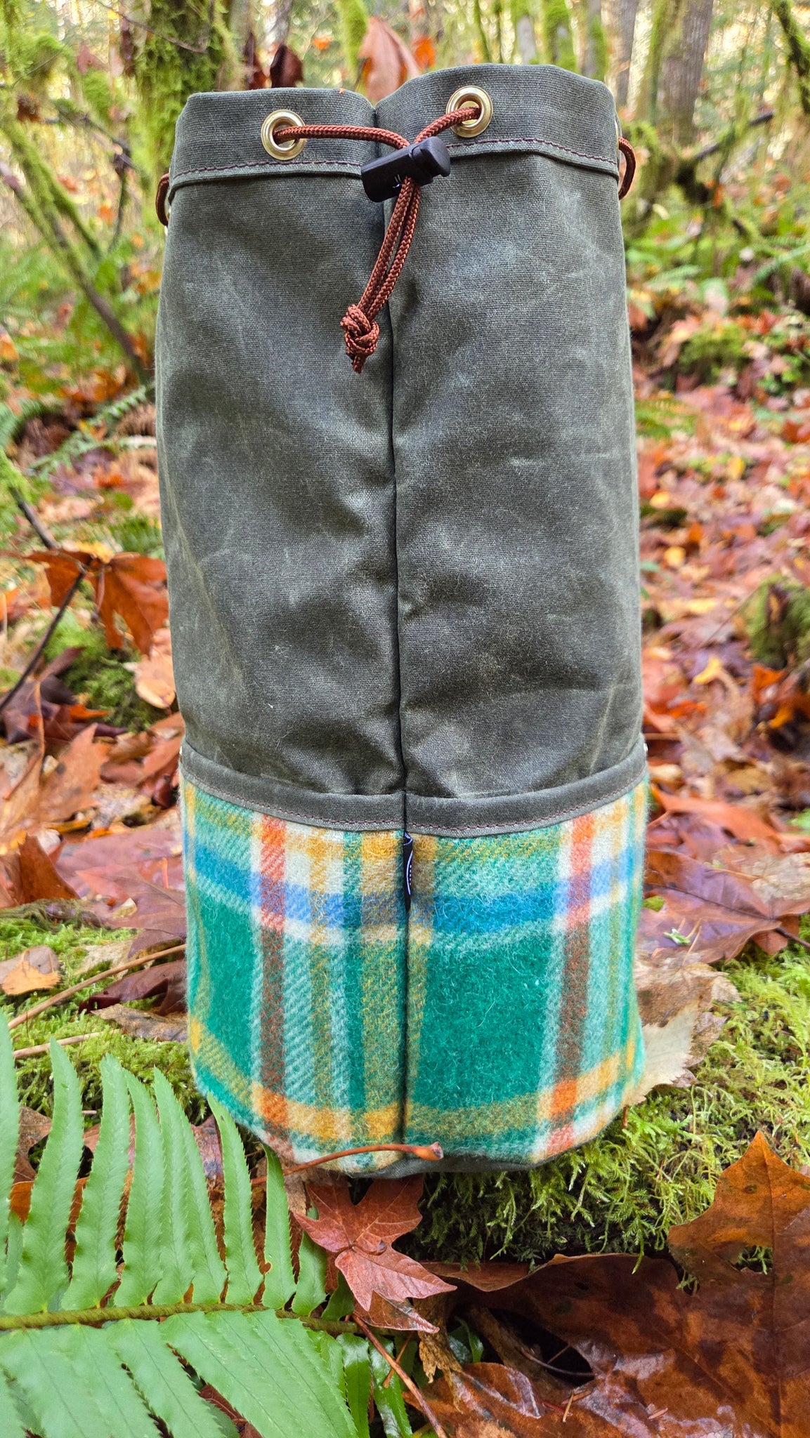 So we designed this one-of-a-kind XL bag using our rugged 10.1 oz waxed canvas in deep forest green, wrapped the five outer pockets in bold vintage wool, and added brass grommets and brown paracord to close it up tight. It stands tall at 15" with an 8.5" diameter, and those outside pockets measure 5.75" deep by 5" wide—ready to carry your essentials in the woods, at camp, or anywhere nature calls.