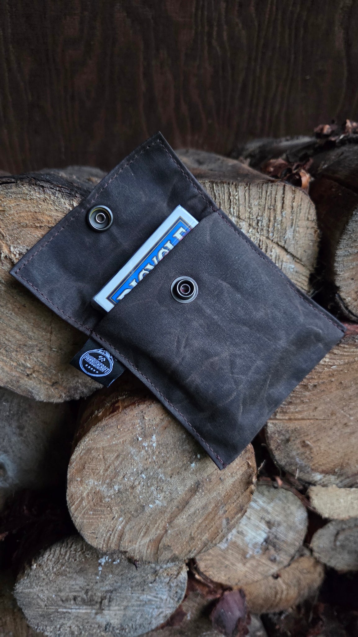 We created this little-waxed canvas bag with a snap just for a standard deck of cards. It was designed to fit Bicycle Standard Cards (2.5" by 3.5" by 3/4")