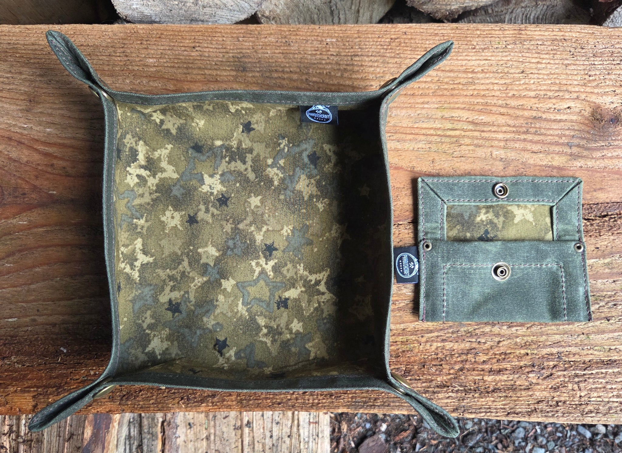 Inspired by the documentary The Hobby and our love for games, this Make It Monday project is a special combo that brings a little magic to your roll. You voted, we listened—and the result is a handcrafted, heirloom-quality set featuring a medium travel tray and tiny dice snap pouch in green 10.1 oz waxed canvas with antique brass hardware.