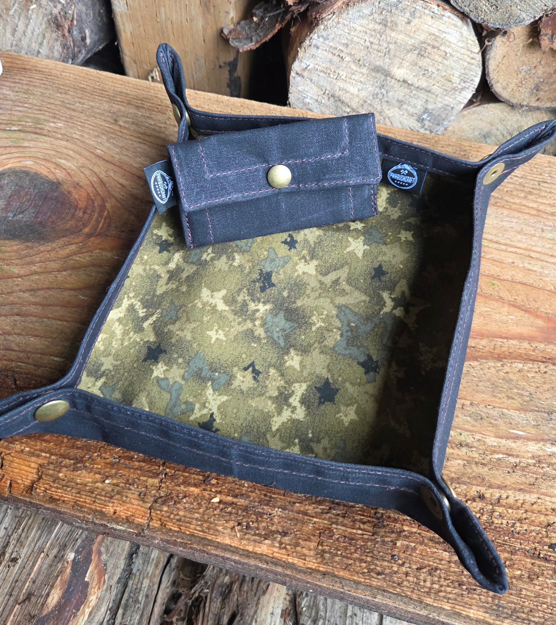 This set was designed with tabletop adventurers in mind, but it's equally perfect for EDC, coins, cord storage, or whatever you need to corral. The tray folds flat for easy transport and snaps up into a handy catch-all wherever you game. The matching tiny pouch is just the right size for your favorite dice set or other small treasures.