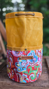 Deluxe Yellow Waxed Canvas Cedar Bucket Bag with 60's Flower Pockets