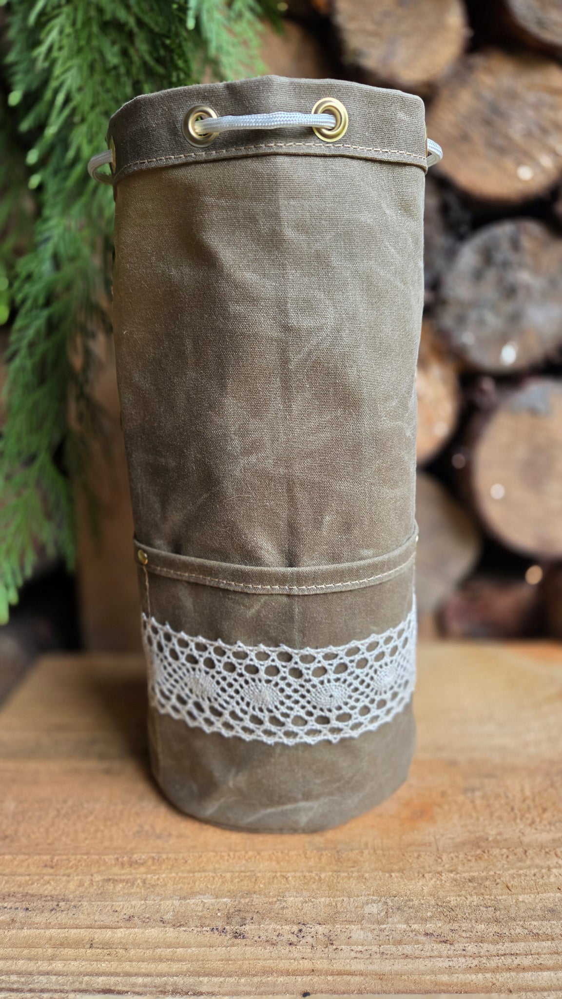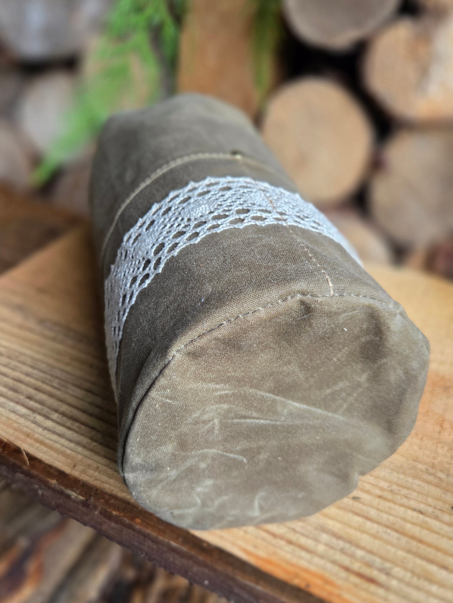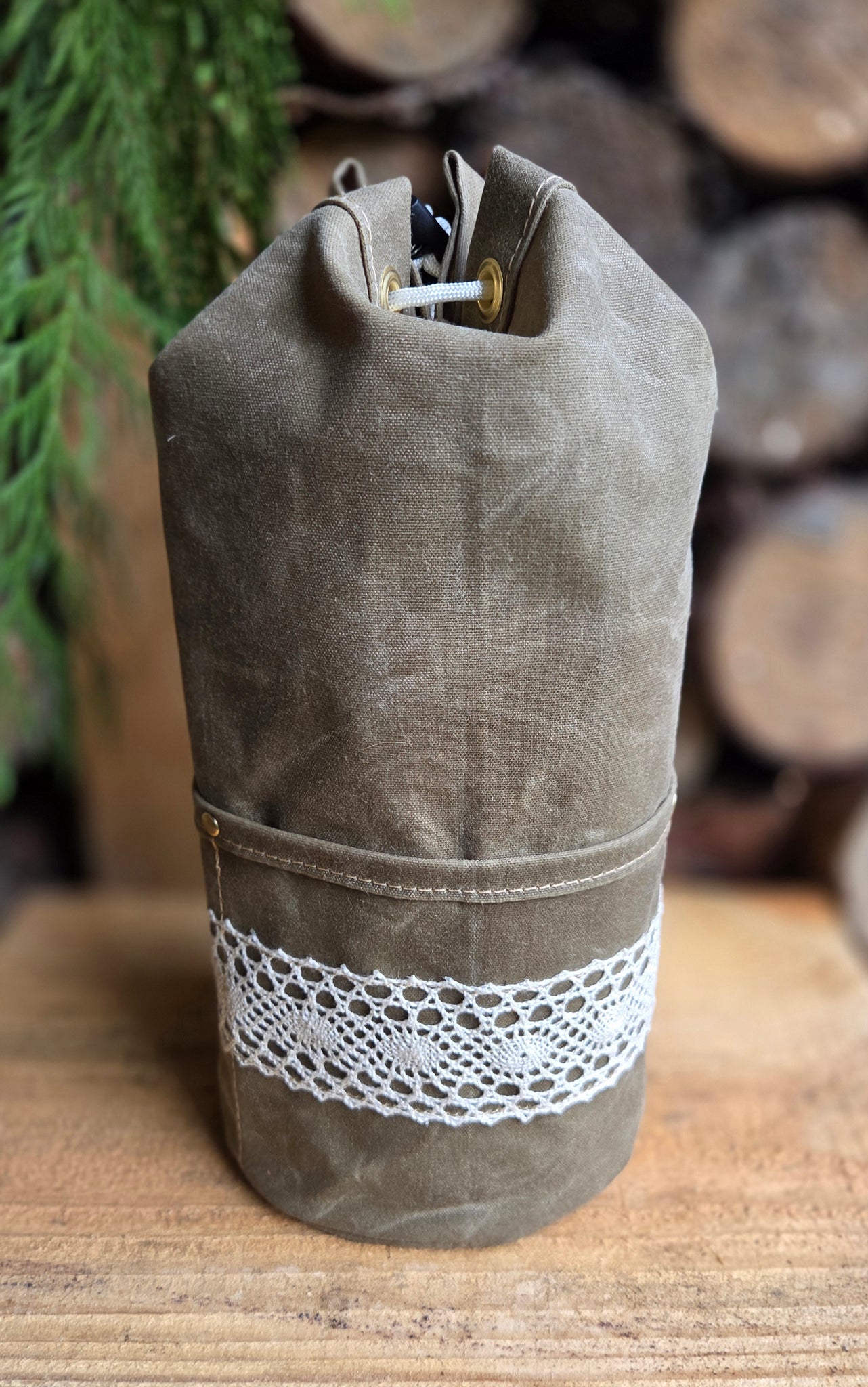 This one-of-a-kind small Cedar Bucket Bag combines rugged functionality with a soft vintage touch. Crafted from durable waxed canvas in tan, this bag is built to endure the elements—yet its standout feature is the vintage lace trim wrapped delicately around the exterior pockets. It's where heirloom meets utility.