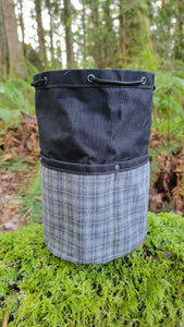 Black Waxed Canvas Cedar Bucket Bag with Grey Wool Wrapped Outside Pockets