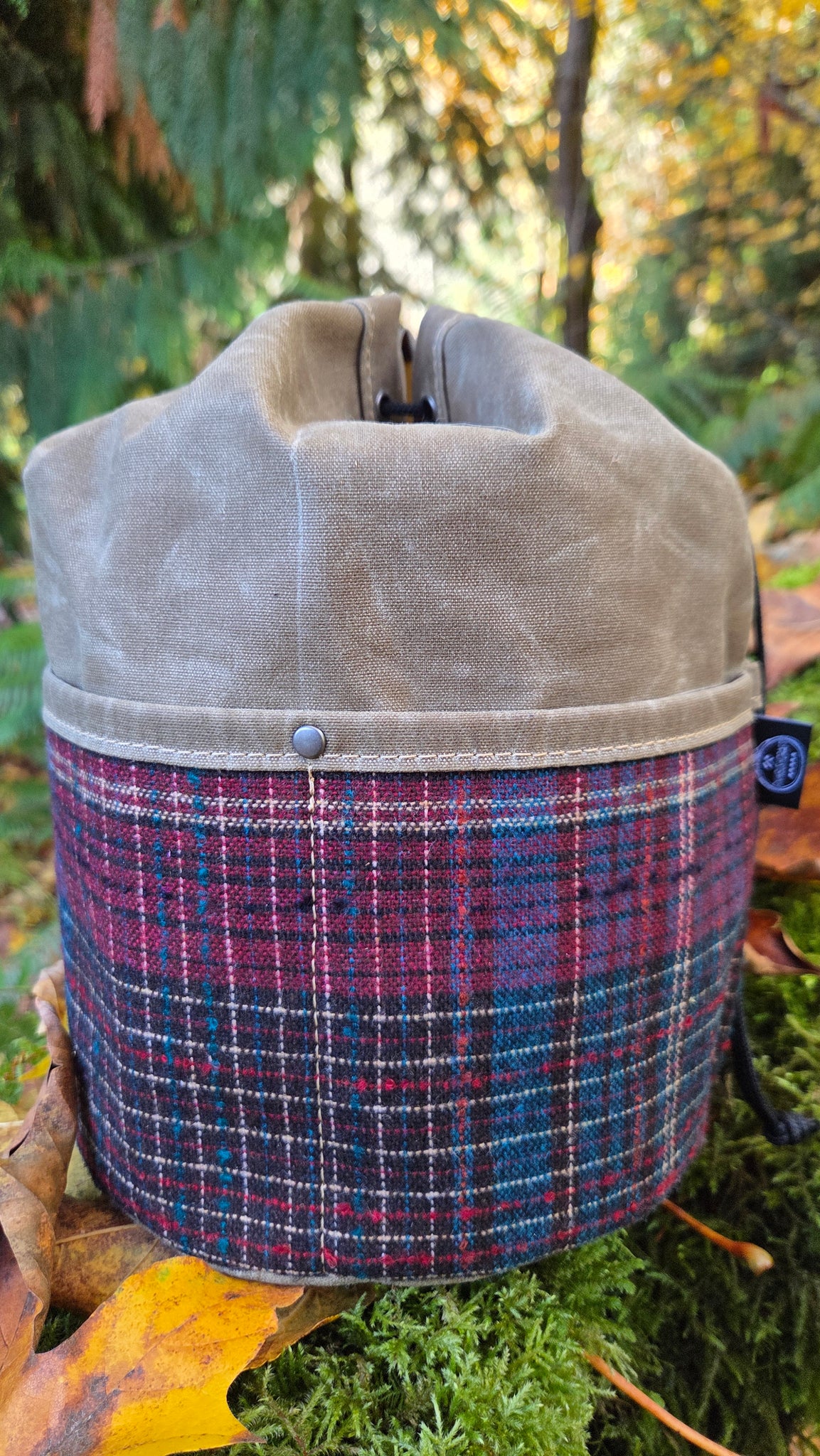 Large Cedar Bucket Bag – Tan Waxed Canvas with Vintage Wool Pockets + Gunmetal Hardware
